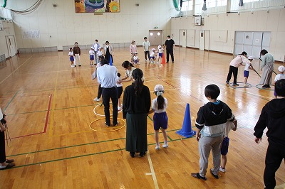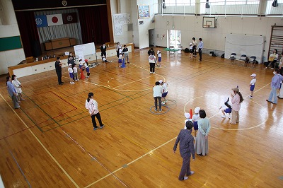 業間の陸上練習の時間に、ちょうど雨が降ってしまいました。今日は、体育館で練習です。